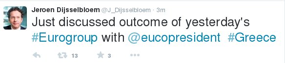 10:41 Ο Γερούν Ντάισελμπλουμ επιβεβαίωσε μέσω του προσωπικού του λογαριασμού στο twitter ότι νωρίς το πρωί πραγματοποιήθηκε μια συζήτηση με τον Ντόναλντ Τουσκ των όσων συνέβησαν στο χθεσινό επεισοδιακό Eurogroup