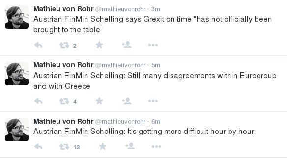 10:50 Ο Γερμανός δημοσιογράφος Μάθιου Φον Ρουρ μεταφέρει δηλώσεις του Αυστριακού ΥΠΟΙΚ Σέλινγκ, ο οποίος αναφέρει ότι υπάρχουν ακόμη πολλές διαφωνίες και μέσα στο Eurogroup αλλά και με την Ελλάδα, πως οι δυσκολίες μεγαλώνουν ώρα με την ώρα ενώ τονίζει ότι η πρόταση του Σόιμπλε δεν έπεσε ποτέ στο τραπέζι κατά τη διάρκεια της χθεσινής συνεδρίασης.