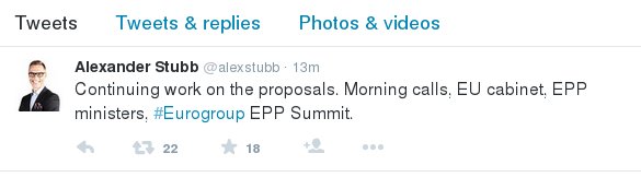 Ο Φινλανδός με ανάρτησή του στον προσωπικό του λογαριασμό στο twitter, ανέφερε ότι οι υπουργοί συνεχίζουν να μελετούν και να δουλεύουν πάνω στις ελληνικές προτάσεις ενώ υπάρχουν και πρωινά τηλεφωνήματα προκειμένου να βρεθεί η άκρη. Θυμίζουμε ότι ο Στουμπ δεχόταν έντονες πιέσεις από την κυβέρνηση της χώρας του προκειμένου να μην πει το «ναι» στο νέο πακέτο βοήθειας στην Ελλάδα.