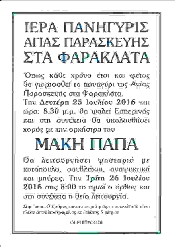 ΦΑΡΑΚΛΑΤΑ: ΙΕΡΑ ΠΑΝΗΓΥΡΙΣ ΑΓΙΑΣ ΠΑΡΑΣΚΕΥΗΣ