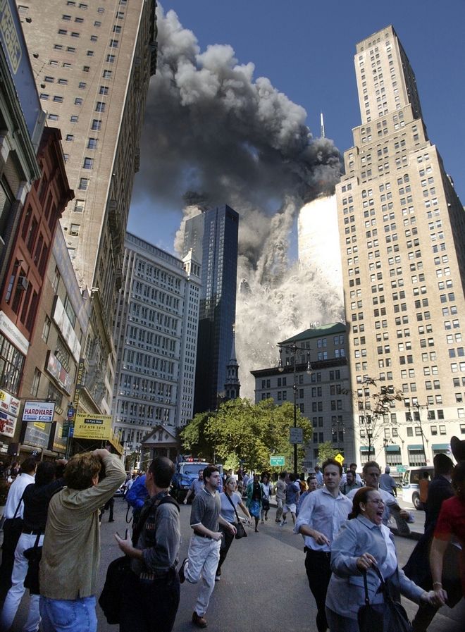 Αλλά η τραγωδία στο Παγκόσμιο Κέντρο Εμπορίου δεν έχει τελειώσει. Με διαφορά λίγων λεπτών, καταρρέουν διαδοχικά οι δίδυμοι πύργοι και ένα τεράστιο σύννεφο σκόνης καλύπτει τον ουρανό του Μανχάταν. Χιλιάδες άνθρωποι βρίσκουν τραγικό θάνατο κάτω από τόνους τσιμέντου.