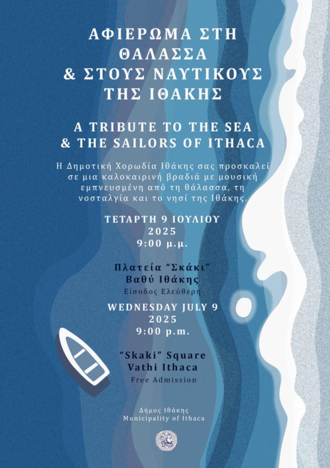 ΣΗΜΕΡΑ 9 Ιουλίου και ώρα 9:00 μ.μ. θα πραγματοποιηθεί καλοκαιρινή Συναυλία Δημοτικής Χορωδίας Ιθάκης.