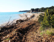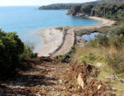 - Πρόσφατα η εταιρεία, κάτω από την ομπρέλα απόλυτης προστασίας που της προσφέρουν ΠΙΝ και κυβέρνηση, καταπατώντας ό,τι έχει απομείνει σε νομοθετικό πλαίσιο βάσει του οποίου προστατεύονται οι μικροί υγρότοποι, προχώρησε με τις «ήπιας ανάπτυξης» μπουλντόζες της στη διάνοιξη δρόμου στον παράκτιο χώρο που χωρίζει τον προστατευόμενο υγρότοπο της Βρωμολίμνης από την θάλασσα. Η εταιρεία δεν δίστασε με τα βαρέως τύπου μηχανήματα της να καταστρέψει και μέρος του επίσης προστατευόμενου δημοτικού λιθόστρωτου Ενετικού μονοπατιού. (συν. Φωτ. 3, 4 & 5 ). Επίσης είναι φανερό πως οι εργασίες αυτές έγιναν απουσία επίβλεψης αρχαιολόγου κάτι που επίσης συνιστά παρανομία.