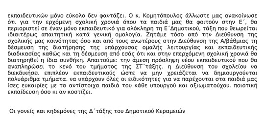 Καταθέτουμε ΑΝΑΦΟΡΑ το Ψήφισμα των Γονέων της Δ΄ Τάξης του Δημοτικού Σχολείου Κεραμειών Κεφαλονιάς, στο οποίο ζητούν να μην συγχωνευτούν τα τμήματα της Δ΄ τάξης του σχολείου τους και να πραγματοποιηθούν οι απαραίτητες προσλήψεις εκπαιδευτικών.