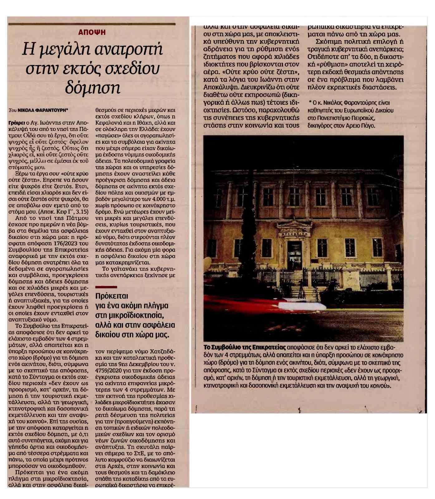Άρθρο-παρέμβαση του Νικόλα Φαραντούρη στην ΚΑΘΗΜΕΡΙΝΗ για την εκτός σχεδίου δόμηση μετά την απόφαση του ΣτΕ: