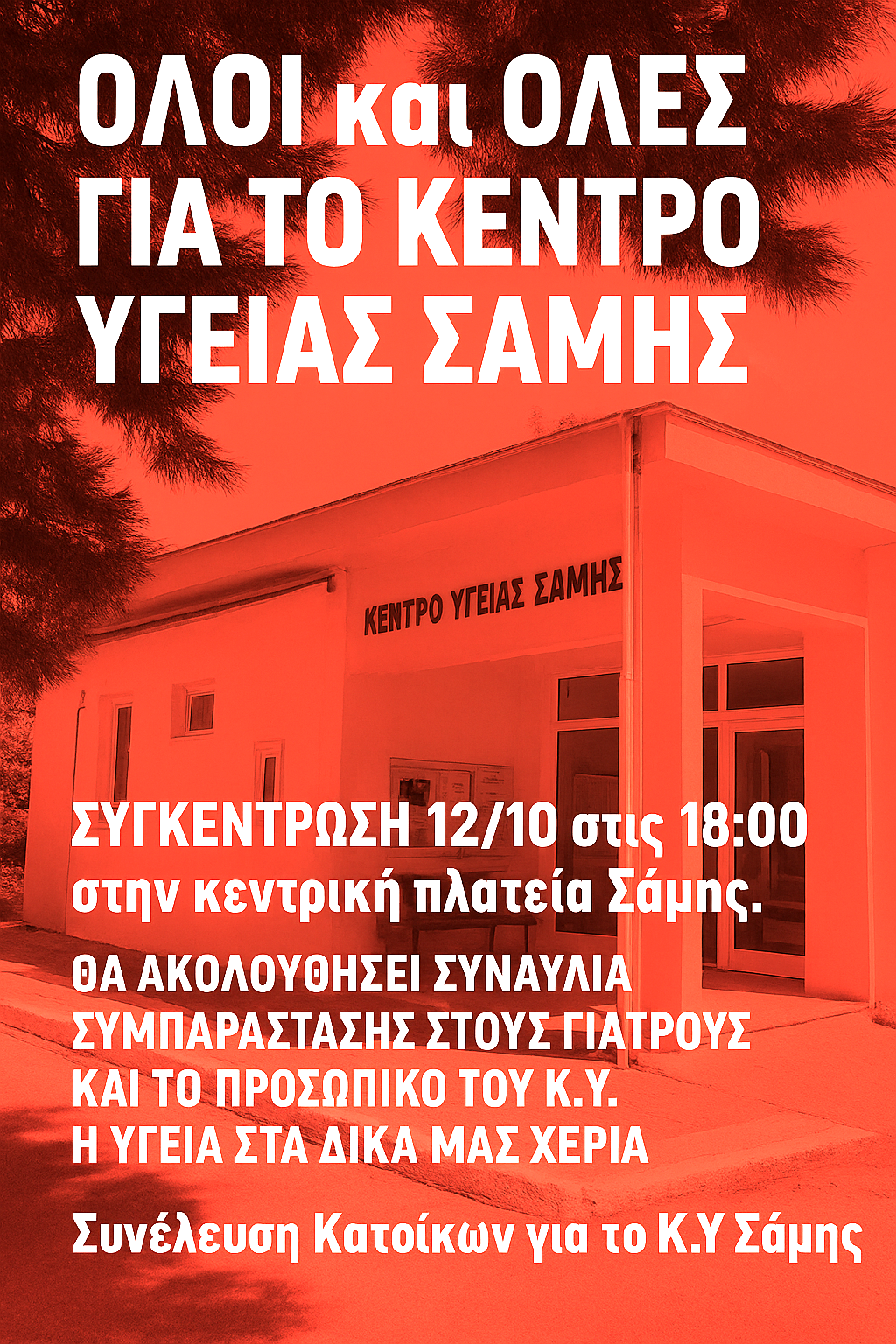 Σε συνέχεια των κινητοποιήσεων που ξεκίνησαν στις 19/9/2025, για τη πλήρη στελέχωση και σωστή λειτουργία του Κ.Υ. Σάμης, η ΠΡΩΤΟΒΟΥΛΙΑ ΠΟΛΙΤΩΝ ΔΗΜΟΥ ΣΑΜΗΣ ΓΙΑ ΤΗ ΣΤΗΡΙΞΗ ΤΟΥ Κ.Υ., καλεί όλους τους δημότες Σάμης, στη συγκέντρωση που διοργανώνει για τη στήριξη του Κ. Υ. τη Κυριακή 12/10/2025 και ώρα 18.00, στη κεντρική πλατεία της Σάμης, για να απαιτήσουμε τη πλήρη στελέχωση και ομαλή λειτουργία του Κ. Υ.