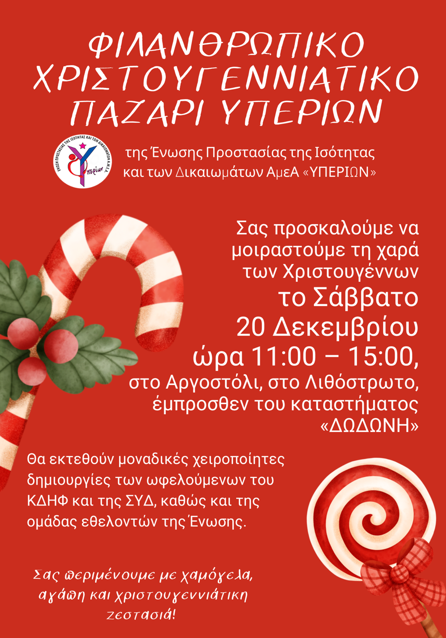 Για πρώτη φορά, η Ένωση Α.μεΑ «ΥΠΕΡΙΩΝ» θα πραγματοποιήσει το Χριστουγεννιάτικο Παζάρι της και στο Αργοστόλι, το Σάββατο 20 Δεκεμβρίου 2025, 11.00-15.00, στο Λιθόστρωτο, έμπροσθεν του καταστήματος «Δωδώνη» .