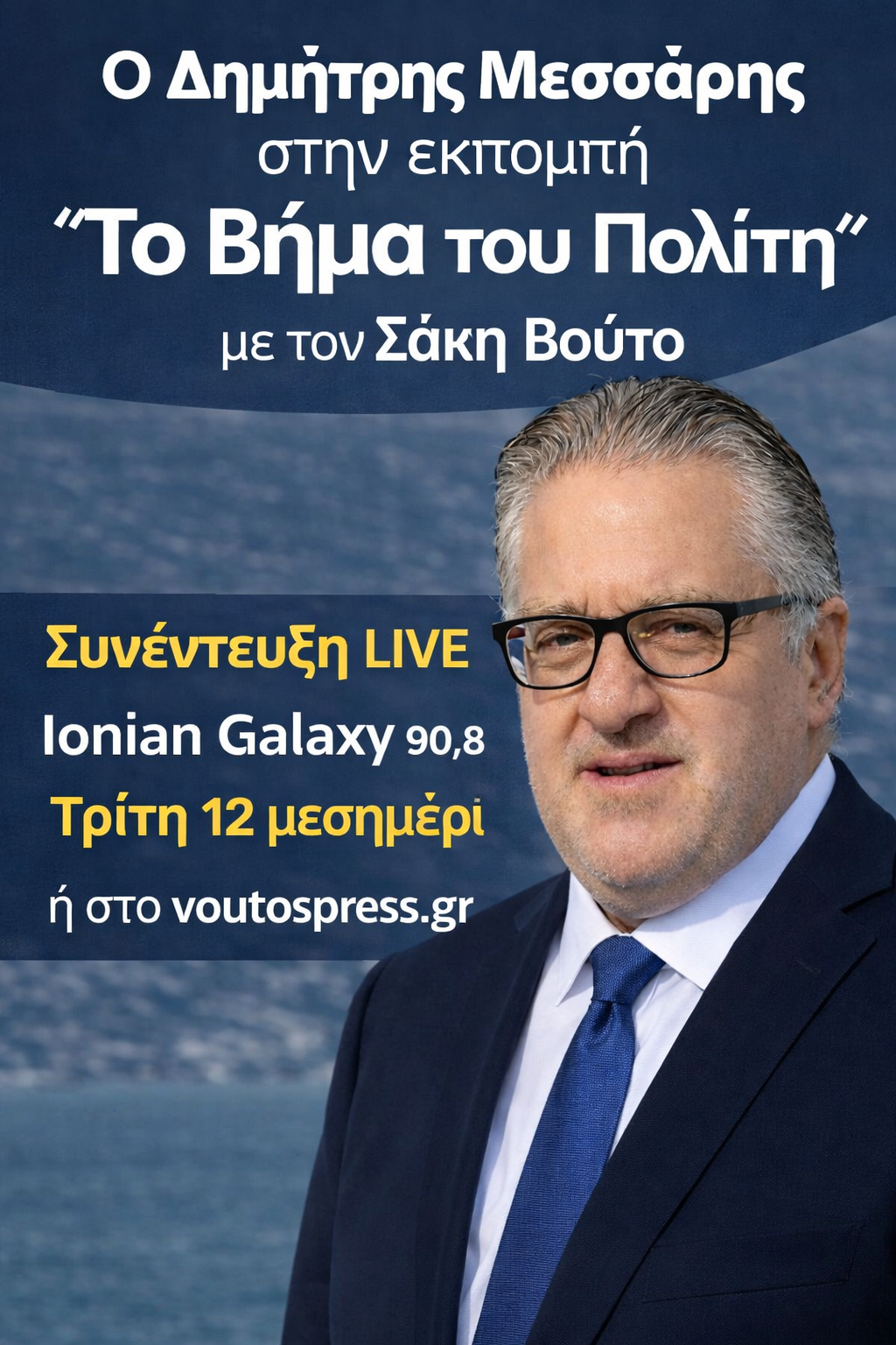 Ραδιοφωνική συνέντευξη του Δημήτρη Μεσσάρη στην εκπομπή «Το βήμα του πολίτη» με τον Σάκη Βούτο, στις 23 Μαρτίου 2026. Η συζήτηση επικεντρώνεται κυρίως στην κατάσταση στο Ληξούρι και γενικότερα στην τοπική αυτοδιοίκηση στην Κεφαλονιά.