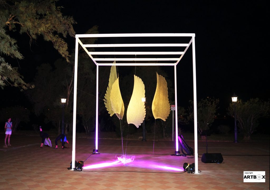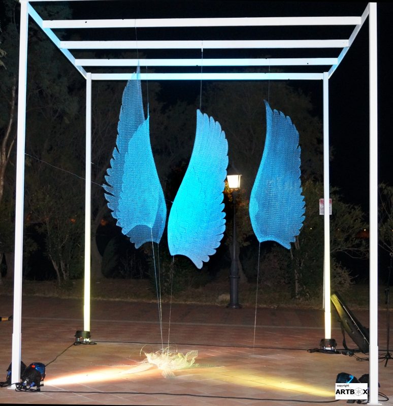 Ο φωτισμός, λειτουργικό στοιχείο της σύνθεσης, χρωματίζει αέναα ονειρικά τα φτερά στα χρώματα της Ίριδας, που εναλλάσσονται παράγοντας στο θεατή ποικίλες εντυπώσεις, αισθήματα και συναισθήματα, αγγίζοντας αδιόρατα τις ευαισθησίες, τις εμπειρίες, τις αναζητήσεις, τους πόθους, τα όνειρα και τις ανάγκες του.
