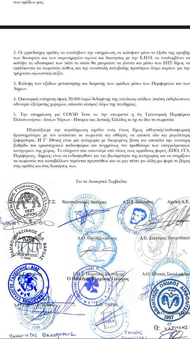 Πλησιάζουμε την συμπλήρωση σχεδόν ενός έτους δίχως αθλητική/ποδοσφαιρική δρα-στηριότητα με τον αντίκτυπο σε σωματεία και αθλητές να αποκτά όλο και μεγαλύτερη ζοφε-ρότητα. Η Γ’ Εθνική είναι μία κατηγορία με διευρυμένη βάση και αποτελεί την ανώτερη βαθμίδα του ερασιτεχνικού ποδοσφαίρου και συγχρόνως τον προθάλαμο των επαγγελματικών κατηγοριών της χώρας. Το ελάχιστο που απαιτούμε από όλους τους αρμόδιους φορείς (ΕΠΟ, ΓΓΑ, Περιφέρειες, Δήμους) είναι να ενδιαφερθούν για την βιωσιμότητα της κατηγορίας και να στηρίξουν τα σωματεία που καταβάλλουν τεράστια προσπάθεια και να μην πέσει για άλλη μια φορά το βάρος στις ομάδες και στις διοικήσεις.
