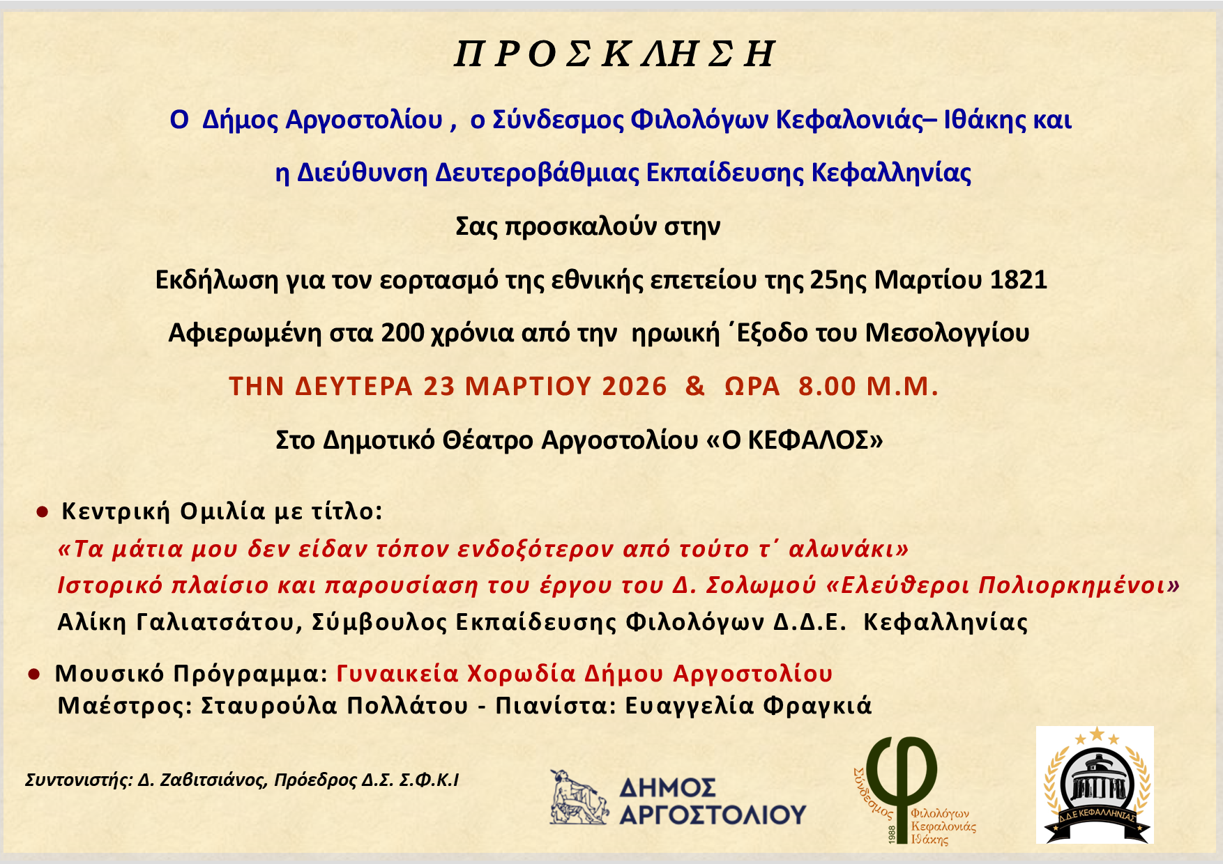 Πίσω στην Αρχική Εκδήλωση για τον εορτασμό της εθνικής επετείου της 25ης Μαρτίου 1821 23/03/2026 Πηγή Voutos Press Tweet Share Plus one Pin It Άλλα άρθρα «Η τραγωδία της 19χρονης αποκάλυψε ένα βαθύ πρόβλημα: Ναρκωτικά, υποστελεχωμένη υγεία και ευθύνες χωρίς απαντήσεις στην Κεφαλονιά» 1. Ο θάνατος της 19χρονης Μυρτούς και το ζήτημα των ναρκωτικώνΟ θάνατος της 19χρονης παρουσιάζεται… ΣΥΓΧΑΡΗΤΗΡΙΑ ΣΤΟΝ ΠΑΠΑΔΗΜΑΤΟ ΓΙΩΡΓΟ Το Δ.Σ. του Ναυτικού Ομίλου Αργοστολίου θα ήθελε να συγχαρεί τον πρώην αθλητή μας Παπαδημάτο… Το Πραξικόπημα της 21ης Απριλίου 1967 Στρατιωτικό κίνημα, που εξερράγη τα ξημερώματα τις 21ης Απριλίου 1967, με επικεφαλής τον ταξίαρχο Στυλιανό…