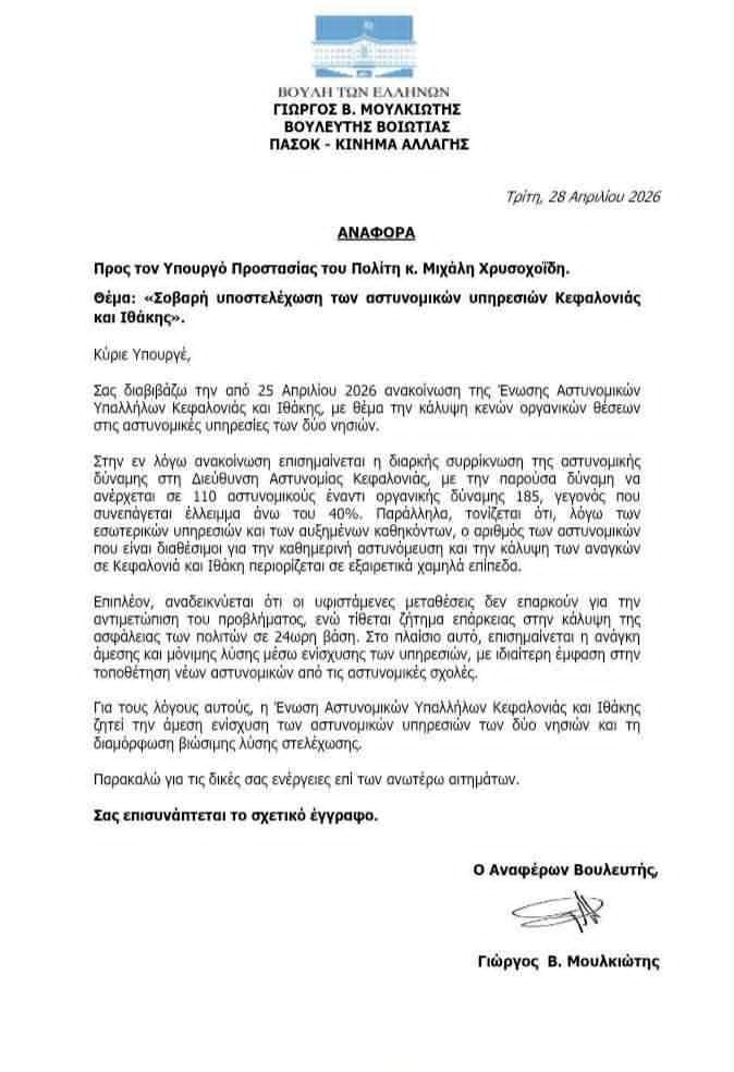 Με οργανική δύναμη 185 ατόμων και παρούσα μόλις 110, η έλλειψη ξεπερνά το 40%, ενώ –όπως τονίζεται– οι διαθέσιμοι αστυνομικοί για εξωτερικές υπηρεσίες σε Κεφαλονιά και Ιθάκη δεν ξεπερνούν τους 30 για όλο το εικοσιτετράωρο.