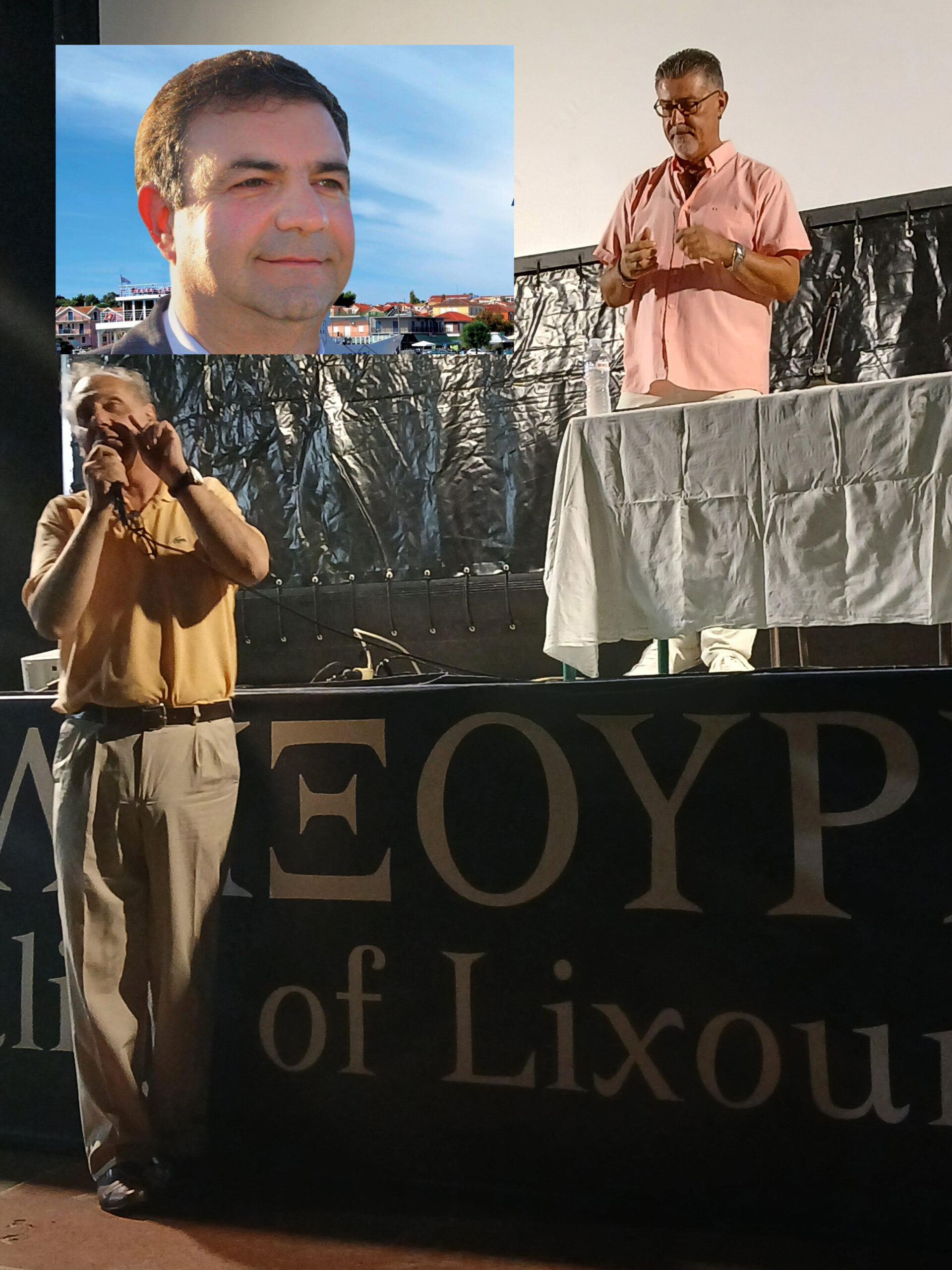 Στιγμιότυπο από την προβολή του ντοκιμαντέρ. Στο μικρόφωνο ο Γεράσιμος Γαλανός ενώ παρακολουθεί ο Γρηγόρης Κούμπουλης. Στην ένθετη ο Δήμαρχος Ληξουρίου κ. Γιώργος Κατσιβέλης