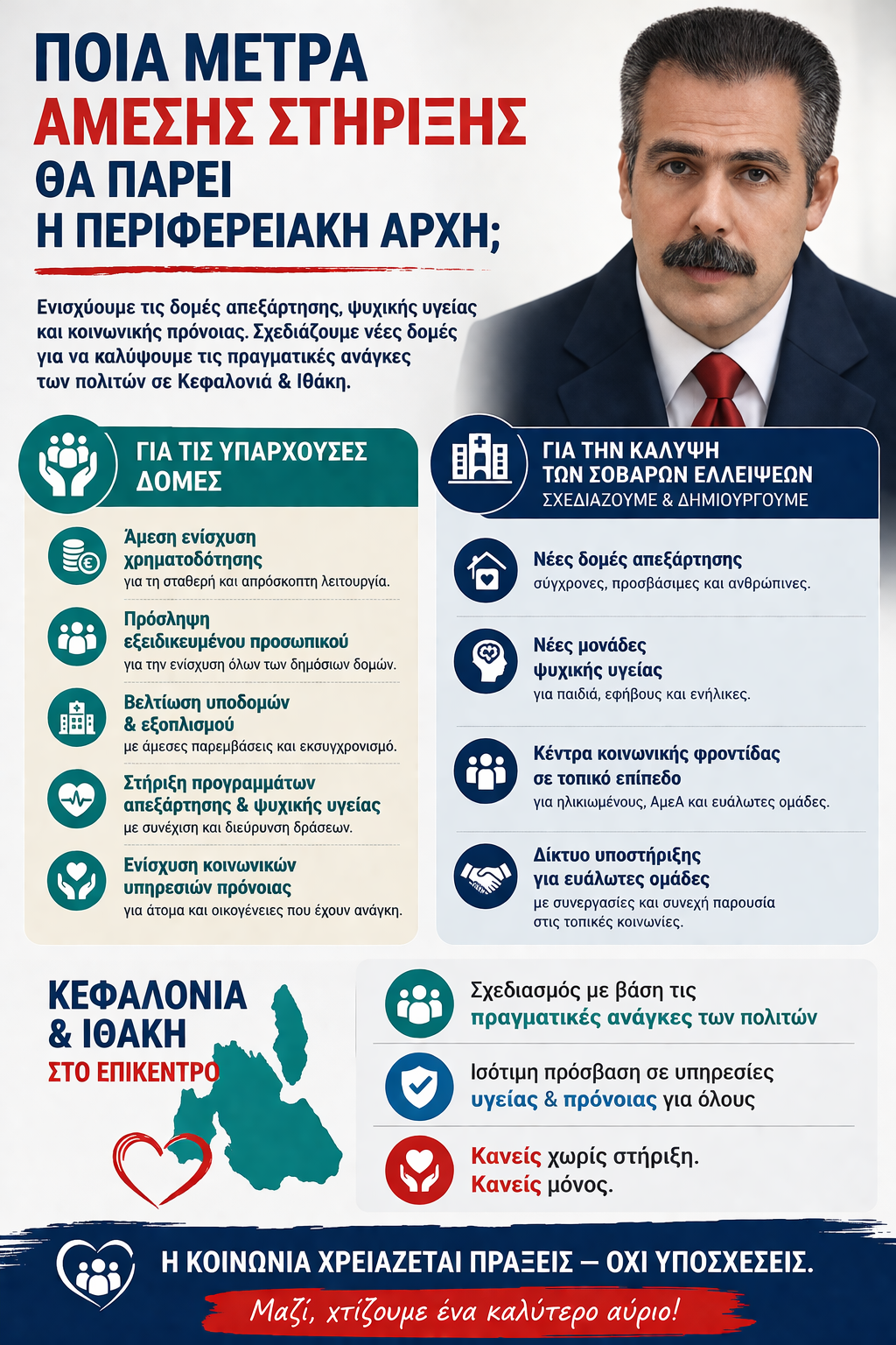 ΠΟΙΑ ΜΕΤΡΑ ΑΜΕΣΗΣ ΣΤΗΡΙΞΗΣ ΠΡΟΤΙΘΕΤΑΙ ΝΑ ΠΑΡΕΙ Η ΠΕΡΙΦΕΡΕΙΑΚΗ ΑΡΧΗ ΓΙΑ ΤΙΣ ΥΠΑΡΧΟΥΣΕΣ ΔΟΜΕΣ ΑΠΕΞΑΡΤΗΣΗΣ, ΨΥΧΙΚΗΣ ΥΓΕΙΑΣ & ΚΟΙΝΩΝΙΚΗΣ ΠΡΟΝΟΙΑΣ ΚΑΙ ΤΙ ΣΧΕΔΙΑΣΜΟ ΕΧΕΙ ΓΙΑ ΤΗΝ ΚΑΛΥΨΗ ΤΩΝ ΣΟΒΑΡΩΝ ΕΛΛΕΙΨΕΩΝ ΜΕ ΤΗΝ ΔΗΜΙΟΥΡΓΙΑ ΝΕΩΝ ΔΟΜΩΝ ΣΤΗΝ ΚΕΦΑΛΟΝΙΑ & ΤΗΝ ΙΘΑΚΗ;