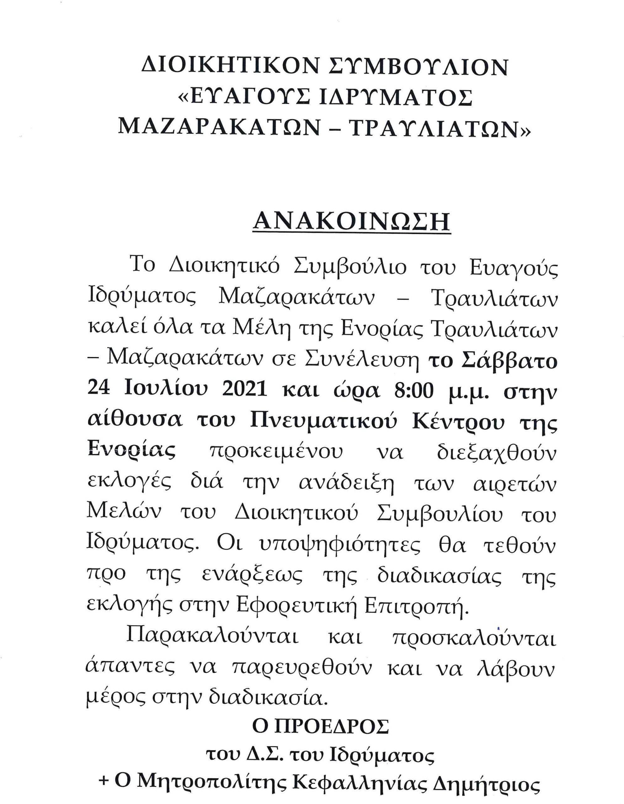Ευαγές Ιδρυμα Μαζαρακάτων – Τραυλιάτων: Εκλογές για την ανάδειξητων μελών του Διοικητικού Συμβουλίου