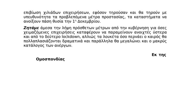 Κατέθεσαν ΑΝΑΦΟΡΑ το κείμενο της Ομοσπονδίας Εμπορίου και Επιχειρηματικότητας Πελοποννήσου, Νοτιοδυτικής Ελλάδος, Ζακύνθου, Κεφαλληνίας & Ιθάκης (Ο.Ε.ΕΣ.Π.) με το οποίο αιτείται τη λήψη πρόσθετων μέτρων από την κυβέρνηση για τη στήριξη των χειμαζόμενων από το 2ο lock down μικρομεσαίων επιχειρήσεων.