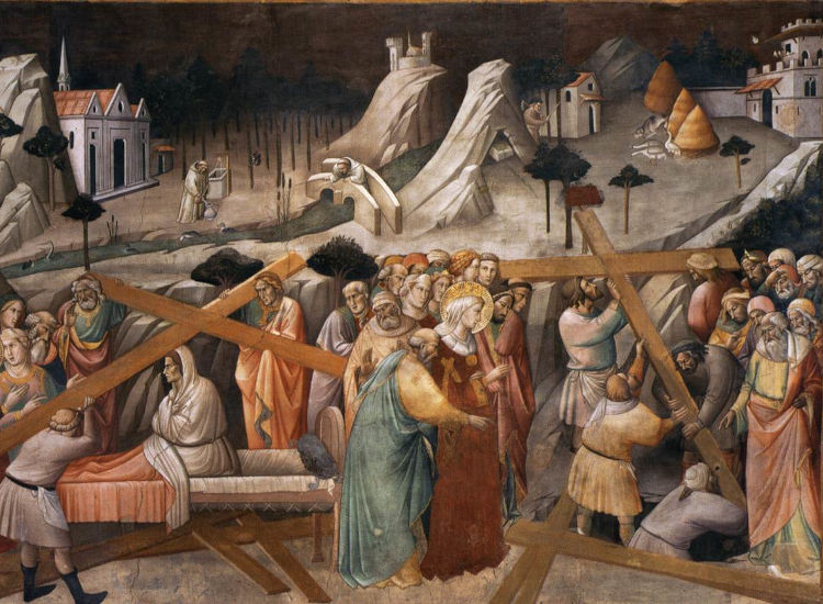 The order in which the images are to be read differs from that in the other frescoes: the recovery of the crosses is shown at the right, and on the left is the identification of the True Cross. Extending behind this is a landscape of a markedly bucolic character, a world that appears to be completely untouched by the events occurring in the foreground.