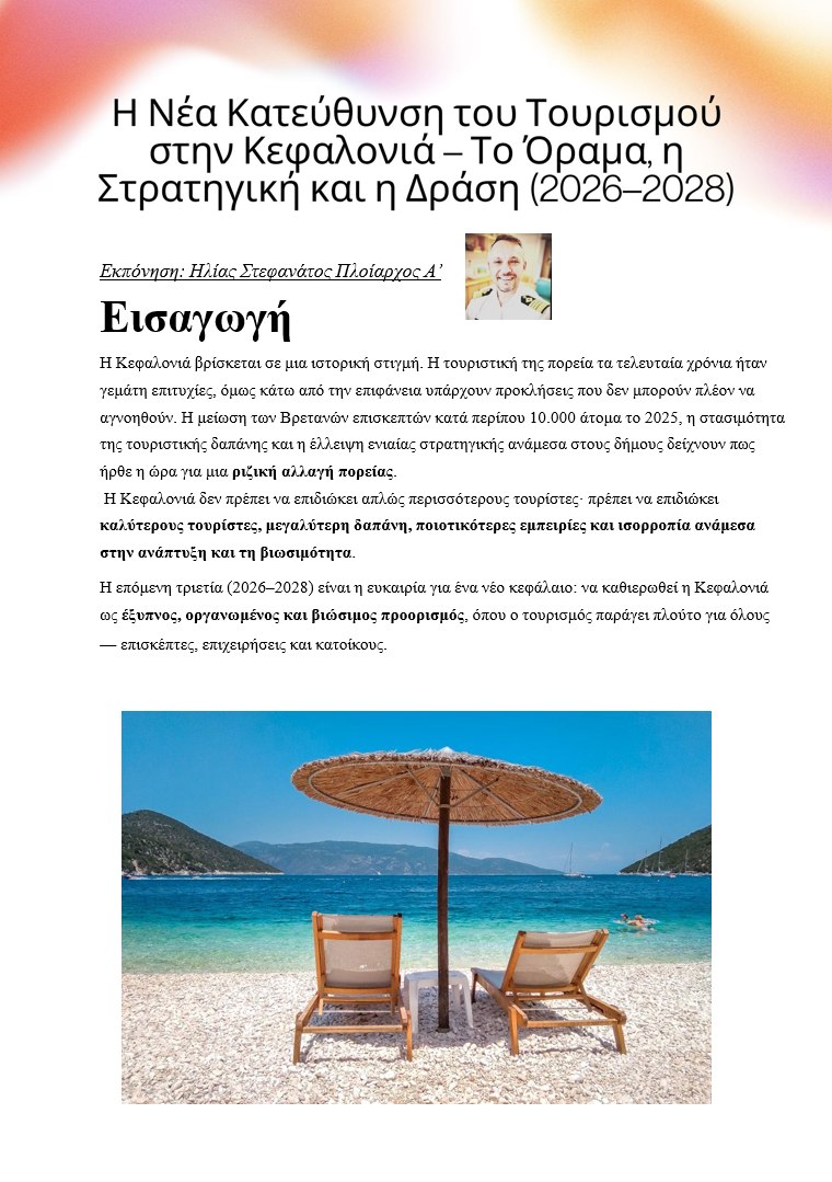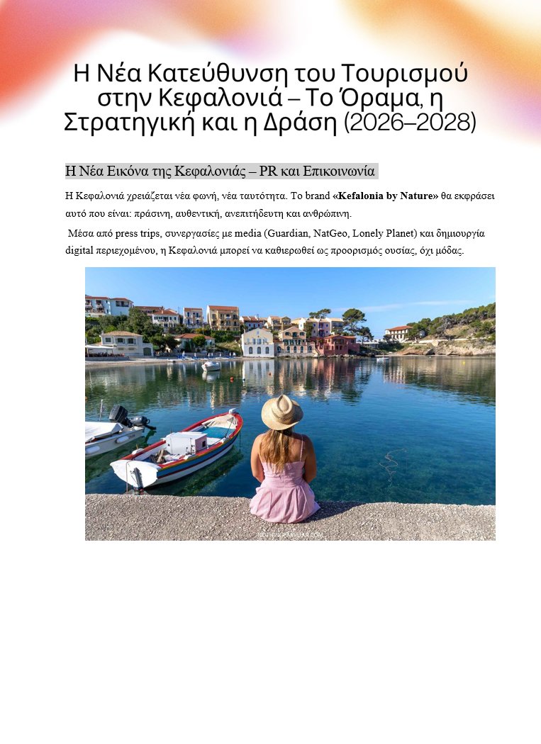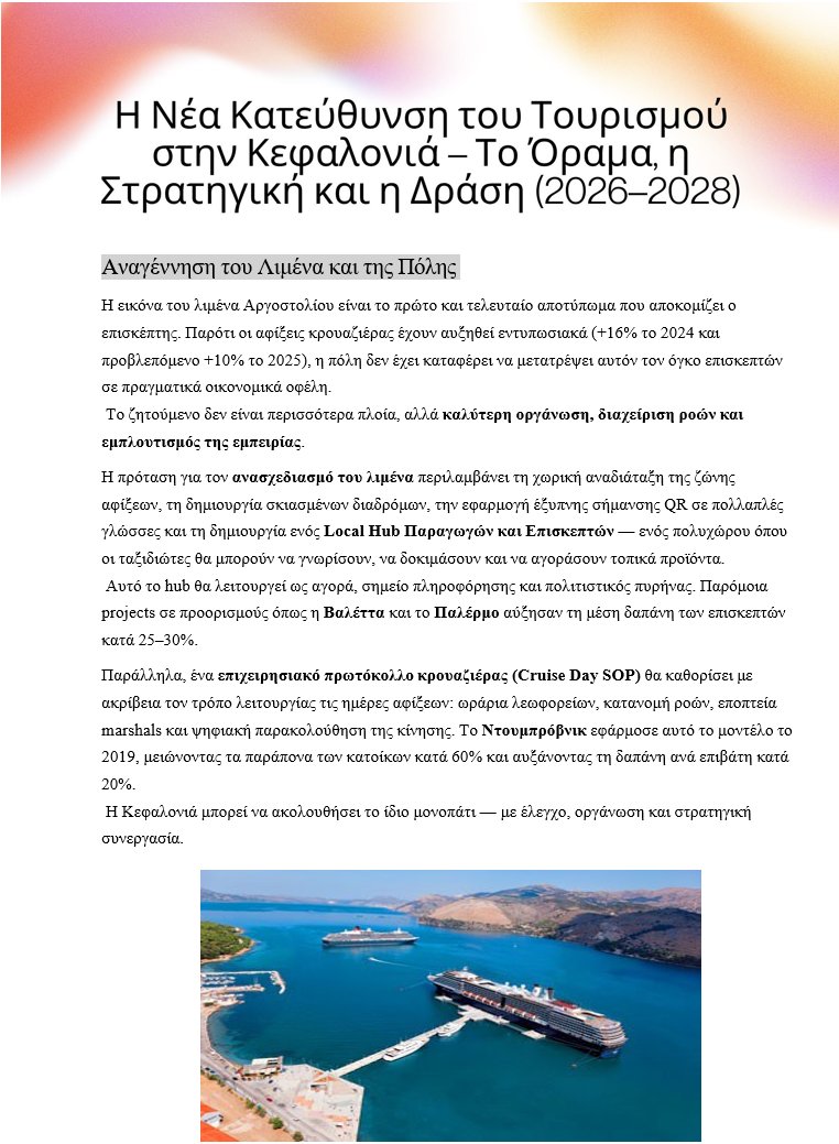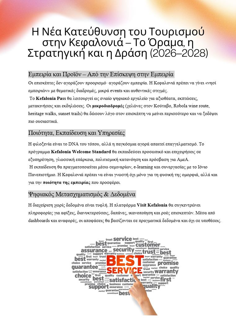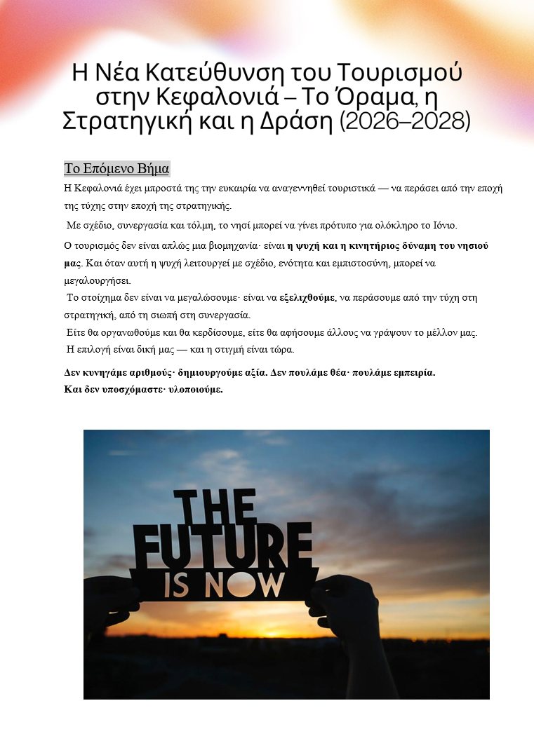 Το Στρατηγικό Σχέδιο Τουριστικής Ανάπτυξης Κεφαλονιάς 2026–2028, δεν αποτελεί απλώς ένα θεωρητικό πλαίσιο αλλά μια ρεαλιστική πορεία δράσης, βασισμένη σε δεδομένα, εμπειρία και κοινή λογική.