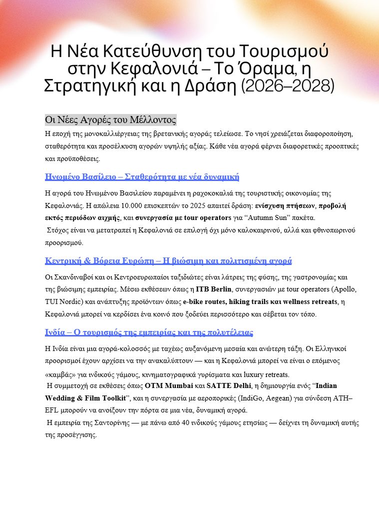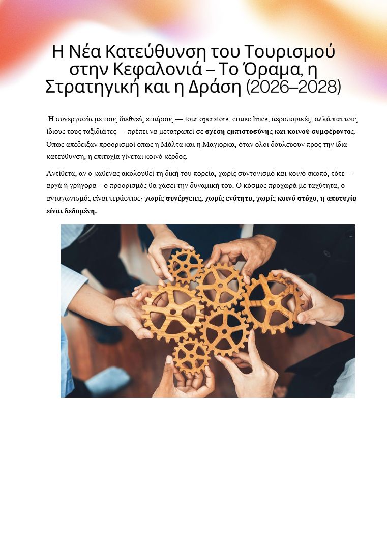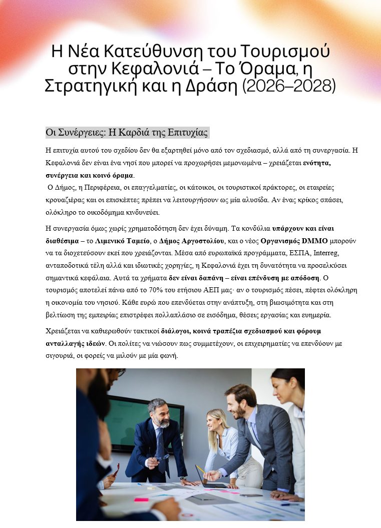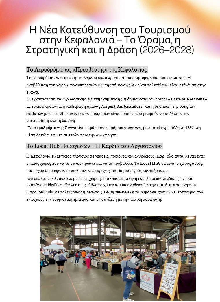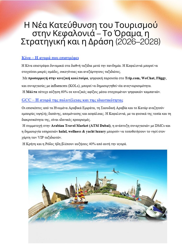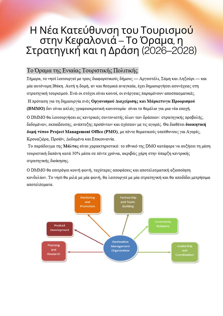 Το Στρατηγικό Σχέδιο Τουριστικής Ανάπτυξης Κεφαλονιάς 2026–2028, δεν αποτελεί απλώς ένα θεωρητικό πλαίσιο αλλά μια ρεαλιστική πορεία δράσης, βασισμένη σε δεδομένα, εμπειρία και κοινή λογική.