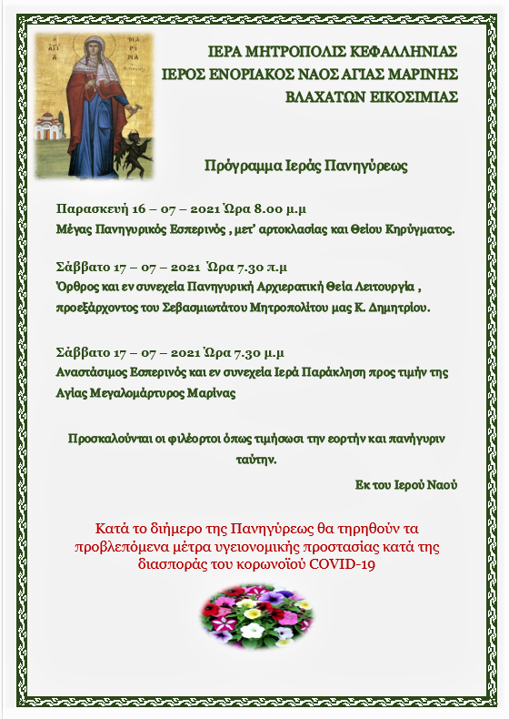 Ιερός Ενοριακός Ναός Αγίας Μαρίνης Βλαχάτων – Πρόγραμμα Πανηγύρεως
