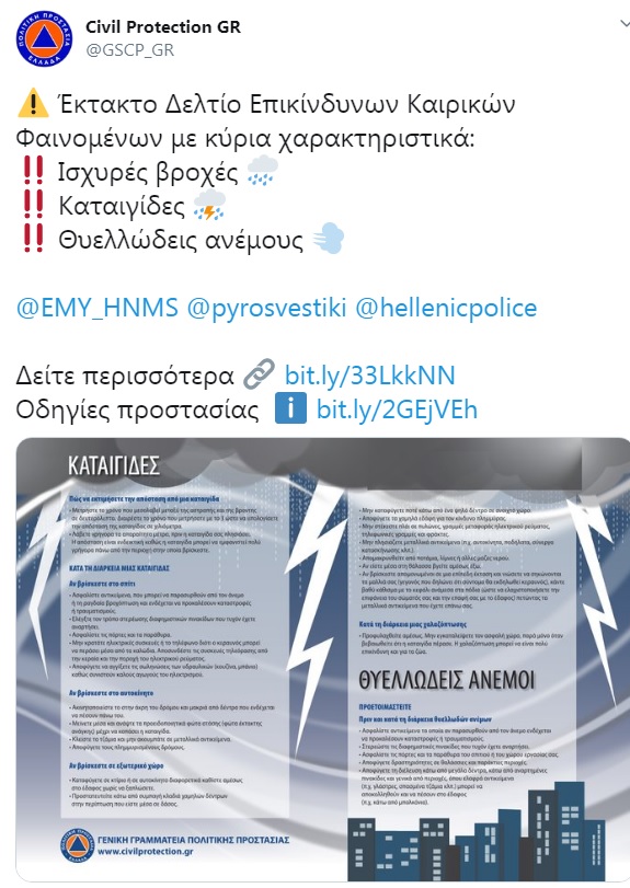 Παράλληλα, συνιστά στους πολίτες να είναι ιδιαίτερα προσεκτικοί, μεριμνώντας για τη λήψη μέτρων αυτοπροστασίας από κινδύνους που προέρχονται από την εκδήλωση των έντονων καιρικών φαινομένων.