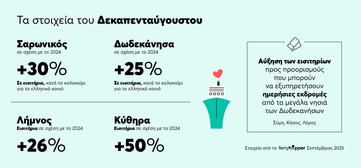 Τα στοιχεία του Ferryhopper δείχνουν επίσης ότι το τριήμερο του Δεκαπενταύγουστου αποτέλεσε το peak της φετινής σεζόν. Η μεγαλύτερη έξοδος καταγράφηκε το Σαββατοκύριακο πριν την αργία, ενώ οι επιστροφές κορυφώθηκαν τη Δευτέρα μετά το τριήμερο, στις 18 Αυγούστου. Αξίζει να αναφερθεί πως σημαντική κίνηση παρατηρήθηκε επίσης στις αρχές Ιουνίου και στο τελευταίο Σαββατοκύριακο του Ιουλίου.