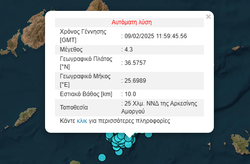 Ακολούθησε άλλος σεισμός μετά από 5 λεπτά 4,3 Ρίχτερ., 25 Χλμ. ΝΝΔ της Αρκεσίνης Αμοργού.