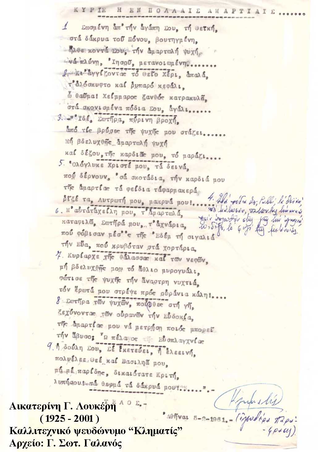 (1925-2001), όντας καθηγήτρια θεολόγος στο Βόλο, συνέθεσε με τον δικό της ποιητικό παλμό, το ποίημα «Εν πολλαίς αμαρτίαις…».