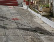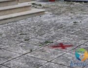 Εξωτερικά, του σημαιοστολισμένου Ναού, υπάρχει επισήμανση στο δάπεδο με κόκκινη μπογιά, προκειμένου να διασφαλιστούν οι αποστάσεις ασφαλείας.