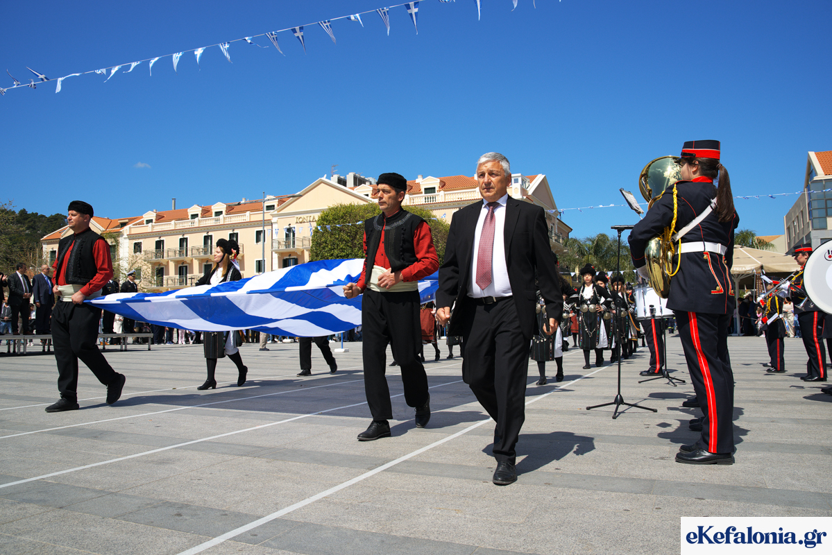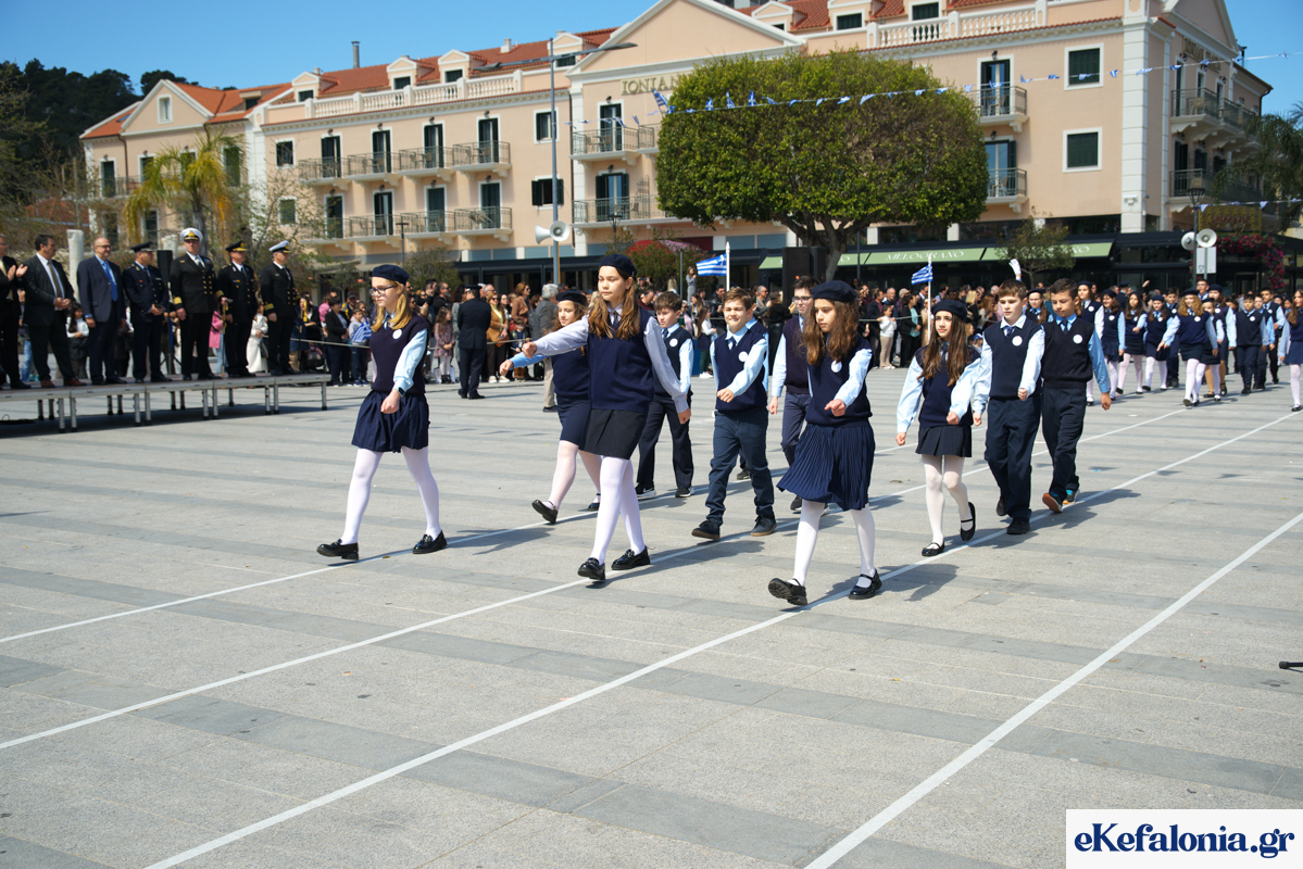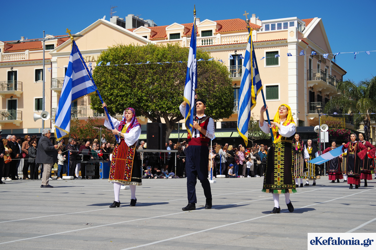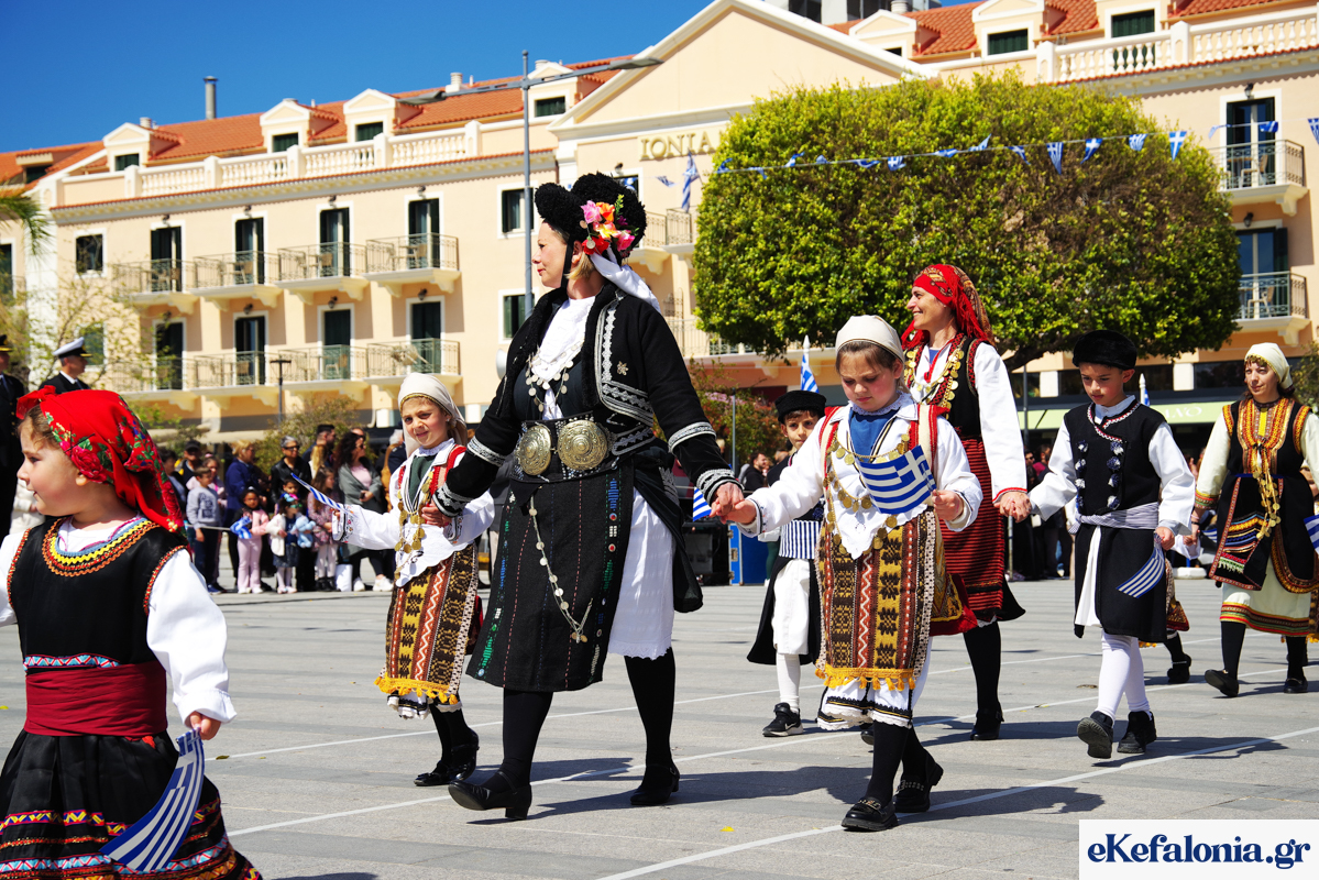 Με την ελληνική σημαία να δεσπόζει, οι μαθητές παρέλασαν με υπερηφάνεια, καταχειροκροτούμενοι από το πλήθος. Τη μουσική επένδυση της παρέλασης ανέλαβαν η Φιλαρμονική του Δήμου Αργοστολίου «Διονύσιος Λαυράγκας» και η Φιλαρμονική Σχολή Κεφαλληνίας, δημιουργώντας μια ατμόσφαιρα εθνικής ανάτασης.