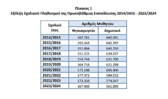 Στον πίνακα 1 απεικονίζεται η εξέλιξη του σχολικού πληθυσμού νηπιαγωγείων και δημοτικών από το σχολικό έτος 2014/2015 έως το σχολικό έτος 2023/2024.