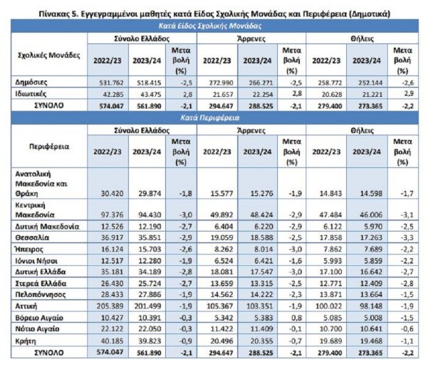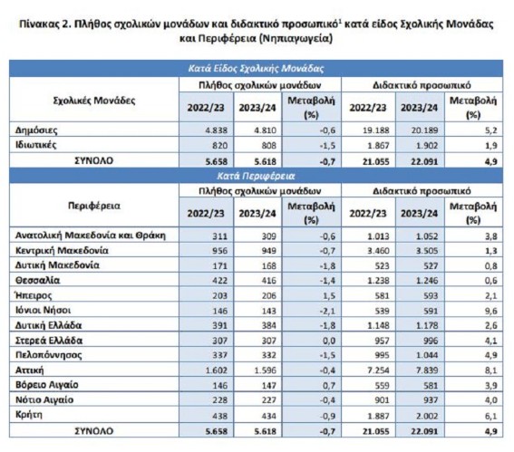 Η Ελληνική Στατιστική Αρχή (ΕΛΣΤΑΤ) ανακοινώνει τα στοιχεία που αφορούν στις στατιστικές Πρωτοβάθμιας Εκπαίδευσης (νηπιαγωγεία και δημοτικά) του σχολικού έτους 2023/2024.