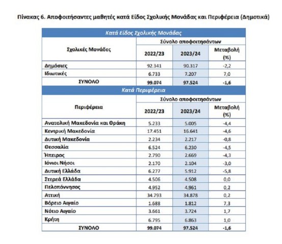 δ) Οι αποφοιτήσαντες μαθητές κατά το σχολικό έτος 2023/2024, σε σχέση με το 2022/2023, παρουσίασαν μείωση κατά 1,6% στα δημοτικά (πίνακας 6).