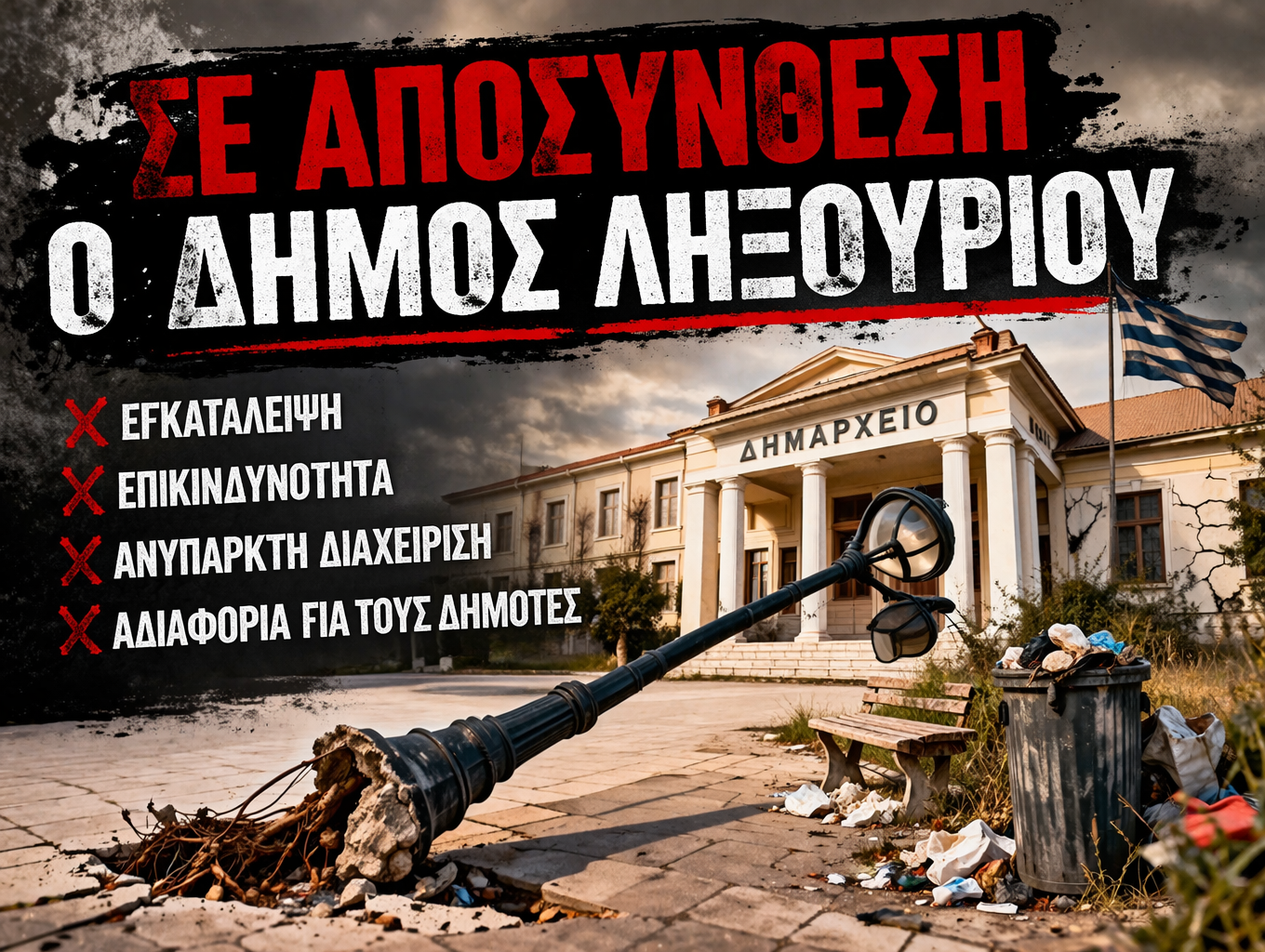 Ως παράταξη, εδώ και ένα χρόνο και συγκεκριμένα στο Δημοτικό Συμβούλιο, στις 23-03-2025, τονίσαμε ότι οι φωτιστικοί  στύλοι της κεντρικής πλατείας, έχουν πρόβλημα. Από αρχής επισημάναμε, ότι η ταλάντωσή τους είναι αδικαιολόγητη και ότι κάτι πρέπει να γίνει άμεσα.  Δεν θα αναφέρω την απάντηση του Δημάρχου κατά την επισήμανση του προβλήματος στο συγκεκριμένο δημοτικό συμβούλιο, γιατί εκ του αποτελέσματος  αναδεικνύει, όχι μόνο την ελαφρότητα με την οποία αντιμετωπίζει εμάς ως αντιπολίτευση, αλλά και την ελαφρότητα που αντιμετωπίζει την ποιότητα ζωής των πολιτών γενικότερα. Με την λέξη ποιότητα ζωής αναφέρομαι  και σε άλλες λέξεις που εγείρουν άλλου είδους ευθύνες, στις οποίες την παρούσα φάση δεν θα ήθελα να επεκταθώ.  Δεδομένου ότι είναι η τρίτη κατά σειρά φωτιστική κολόνα που  σπάει, θεωρώ πως για να αποφευχθούν τα χειρότερα, πρέπει να αφαιρεθούν προσωρινά ΟΛΕΣ. Λαμβάνοντας υπόψην  ότι οι ,μέχρι τώρα, ατυχείς   παρεμβάσεις   δεν έλυσαν το πρόβλημα, η απομάκρυνση αυτών είναι μονόδρομος  για να αποφευχθούν ΤΑ ΧΕΙΡΟΤΕΡΑ.