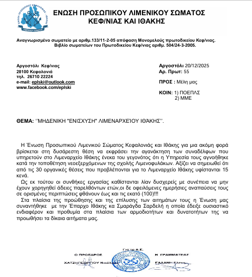 ΜΗΔΕΝΙΚΗ ΕΝΙΣΧΥΣΗ ΛΙΜΕΝΑΡΧΕΙΟΥ ΙΘΑΚΗΣ