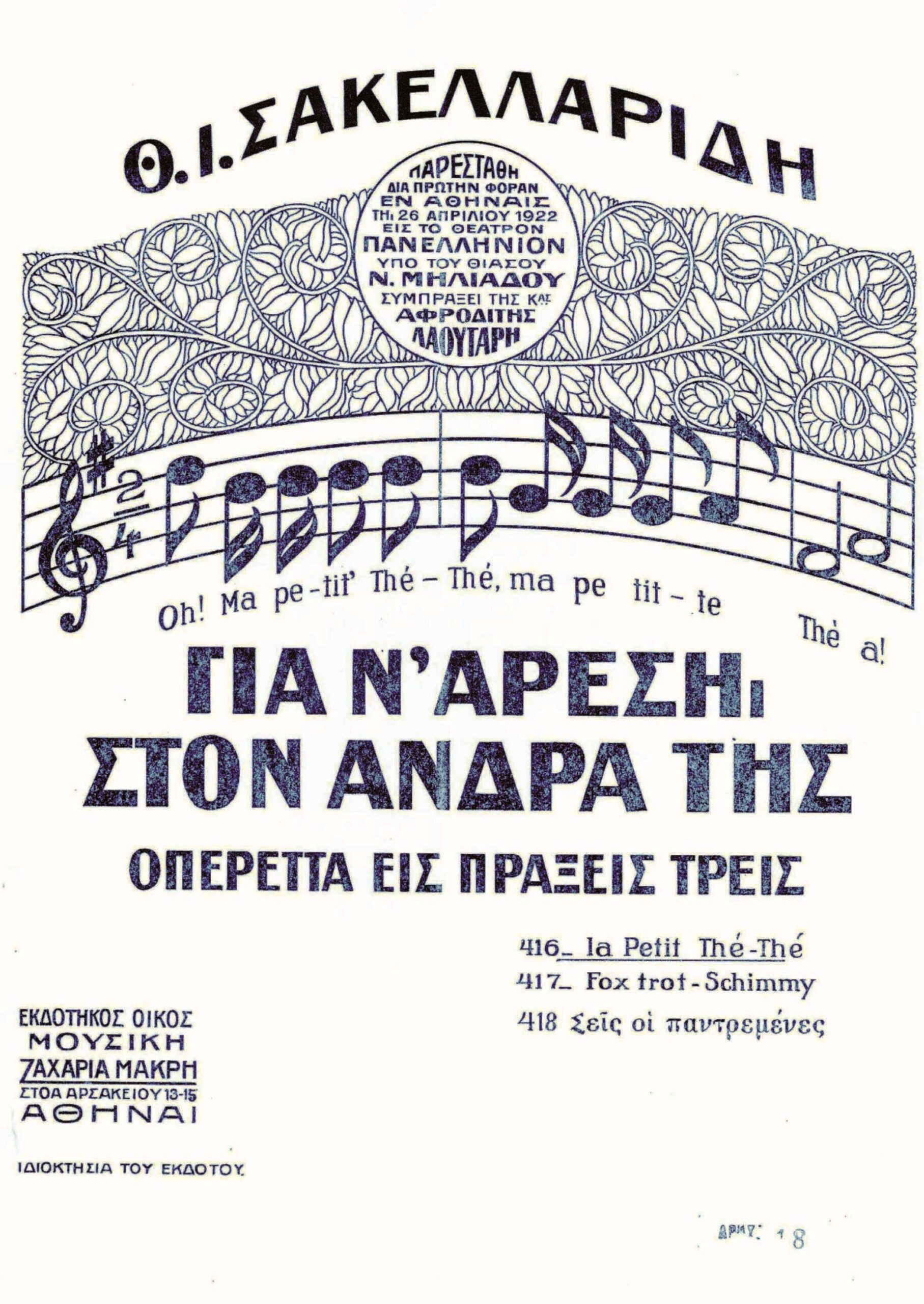 Στις δυο προαναφερόμενες χορωδιακές παρουσιάσεις ακούστηκε το «κανταδοποιημένο» άσμα που όλοι έχουμε ακούσει, η «ΤΕΤΕ». Πρόκειται για ένα υπέροχη καντάδα παρμένη από την οπερέτα του Θ. Ι. Σακελλαρίδη, «Για ν’ αρέση, στον άνδρα της», Οπερέττα εις πράξεις τρείς, την οποία πρωτοφανέρωσε ως μουσικό άκουσμα με τη δική του χορωδία και μαντολινάτα, ο αλησμόνητος μουσουργός Φώτης Αλέπορος. Μάλιστα σε κάποιο σημείο που το ποιητικό κείμενο περιέχει μια μικρή γαλλική φράση, την τροποποίησε με δικό του ερμηνευτικό στίχο και μας την έκανε γνωστή, ως υπέροχη πεταχτή καντάδα με τις χορωδίες του.