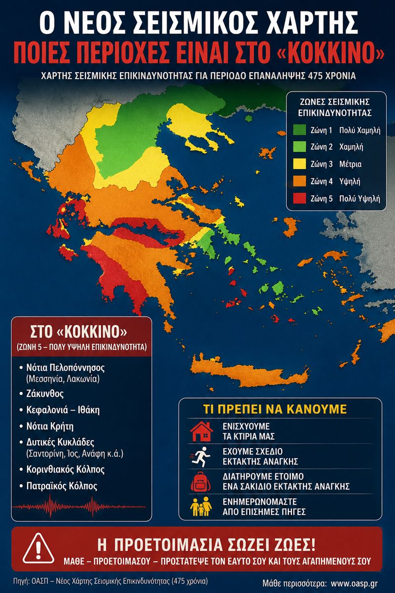 Με βάση τον προτεινόμενο νέο σεισμικό χάρτη, η Ελλάδα χωρίζεται πλέον σε 5 σεισμικές ζώνες, έναντι τριών στον ισχύοντα κανονισμό, κάτι που επιτρέπει λεπτομερέστερη αποτύπωση της χωρικής μεταβλητότητας της σεισμικής επικινδυνότητας, λαμβάνοντας υπόψη και την πληθυσμιακή πυκνότητα.