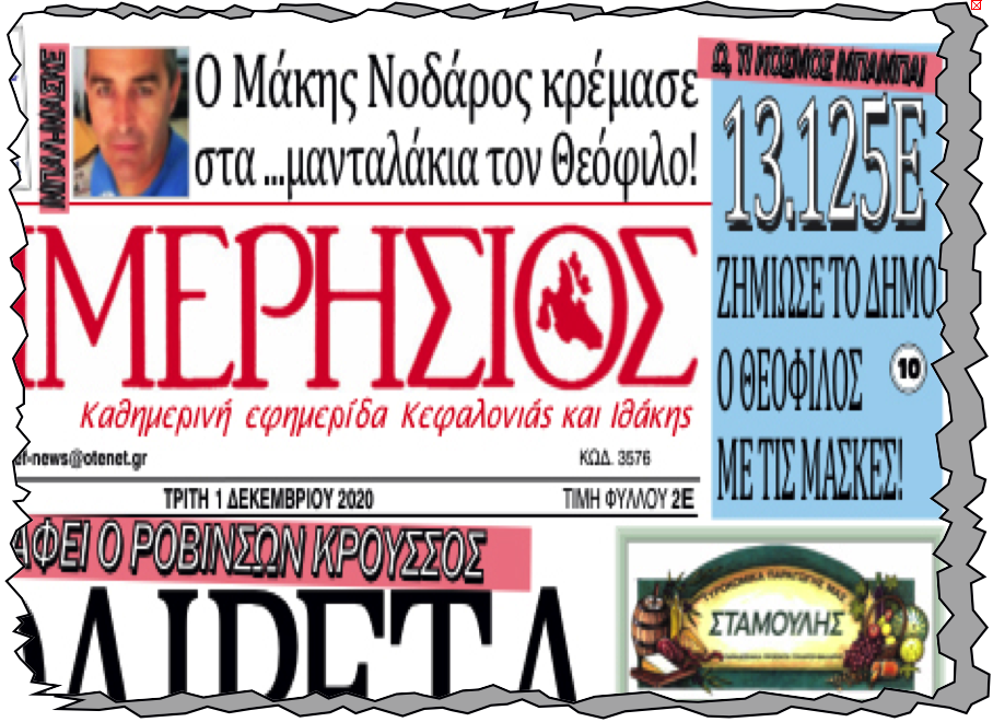 Ο «Η» της 1/12/2020 (αρ. φ. 7.419) με τον Θεόφιλο …κρεμασμένο στα μανταλάκια από τον Νοδάρο και τις 13.125Ε που είναι η ζημιά στο Δήμο Αργοστολίου από το σκάνδαλο με τις μάσκες…