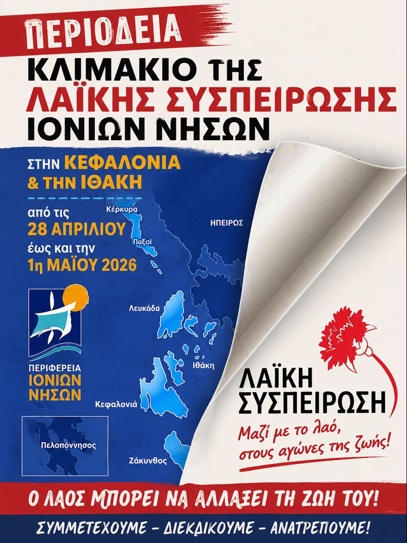 Κλιμάκιο της Λαϊκής Συσπείρωσης Ιονίων Νήσων θα πραγματοποιήσει περιοδεία στην Κεφαλονιά & την Ιθάκη, από τις 28 Απριλίου έως και την 1η Μαΐου 2026.