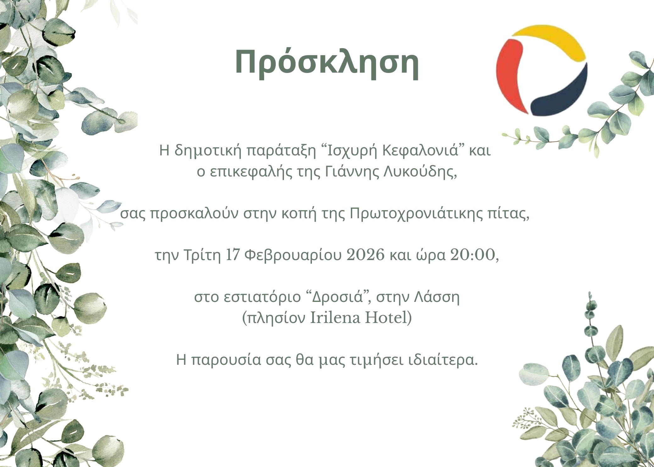 Πίσω στην Αρχική ΠΡΟΣΚΛΗΣΗ ΓΙΑ ΤΗΝ ΚΟΠΗ ΤΗΣ ΠΡΩΤΟΧΡΟΝΙΑΤΙΚΗΣ ΠΙΤΑΣ ΤΗΣ ΠΑΡΑΤΑΞΗΣ “ΙΣΧΥΡΗ ΚΕΦΑΛΟΝΙΑ” 16/02/2026 Πηγή Voutos Press Tweet Share Plus one Pin It Άλλα άρθρα ΙΔΡΥΣΗ ΠΑΡΑΡΤΗΜΑΤΟΣ ΕΜΕ ΚΕΦΑΛΟΝΙΑΣ & ΙΘΑΚΗΣ- ΕΚΛΟΓΕΣ ΕΜΕ-ΚΕΦΑΛΟΝΙΑΣ & ΙΘΑΚΗΣ ΙΔΡΥΣΗ ΠΑΡΑΡΤΗΜΑΤΟΣ ΕΜΕ ΚΕΦΑΛΟΝΙΑΣ & ΙΘΑΚΗΣ- ΕΚΛΟΓΕΣ Πραγματοποιήθηκε στο Αργοστόλι την Κυριακή 19… Μαρίνος Χαρβούρης: Ο μεγαλοφυής Κεφαλλονίτης μηχανικός Έμεινε στην ιστορία για το κατόρθωμά του να μεταφέρει ένα γιγαντιαίο βράχο, πάνω στον οποίο… Τζορτζ Κοσμάτος Ελληνοαμερικανός σκηνοθέτης του κινηματογράφου, δημιουργός μεγάλων εμπορικών επιτυχιών του Χόλυγουντ. Τζορτζ Κοσμάτος (1941 – 2005)…