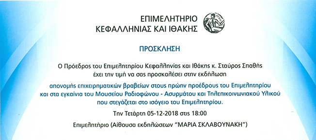 Ο Πρόεδρος του Επιμελητηρίου Κεφαλληνίας και Ιθάκης κ. Σταύρος Σπαθής έχει την τιμή να προσκαλέσει  τους εμπόρους και του επαγγελματίες της Κεφαλονιάς και της Ιθάκης στην εκδήλωση που θα πραγματοποιηθεί την Τετάρτη 05/12/2018 και ώρα 18:00 στην αίθουσα εκδηλώσεων του Επιμελητηρίου  και θα περιλαμβάνει την απονομή επιχειρηματικών βραβείων στους πρώην προέδρους του Επιμελητηρίου, την  ονοματοδοσία της αίθουσας εκδηλώσεων του Επιμελητηρίου σε αίθουσα εκδηλώσεων «ΜΑΡΙΑ ΣΚΛΑΒΟΥΝΑΚΗ» και τα εγκαίνια του Μουσείου Ραδιοφώνου – Ασυρμάτου και Τηλεπικοινωνιακού Υλικού που στεγάζεται στο ισόγειο του Επιμελητηρίου.