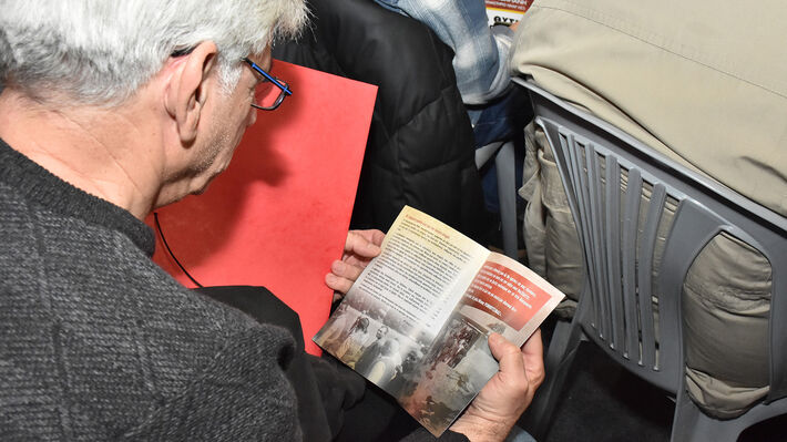 Μέσα στον φάκελο βρήκαν και ένα ειδικό εκδοτικό αφιέρωμα του ΠΑΜΕ, αφιερωμένο στη θυσία των 200 κομμουνιστών που εκτελέστηκαν στην Καισαριανή την Πρωτομαγιά του 1944, λίγα μέτρα μακριά από το σημείο που πραγματοποιείται η σύσκεψη του ΠΑΜΕ.