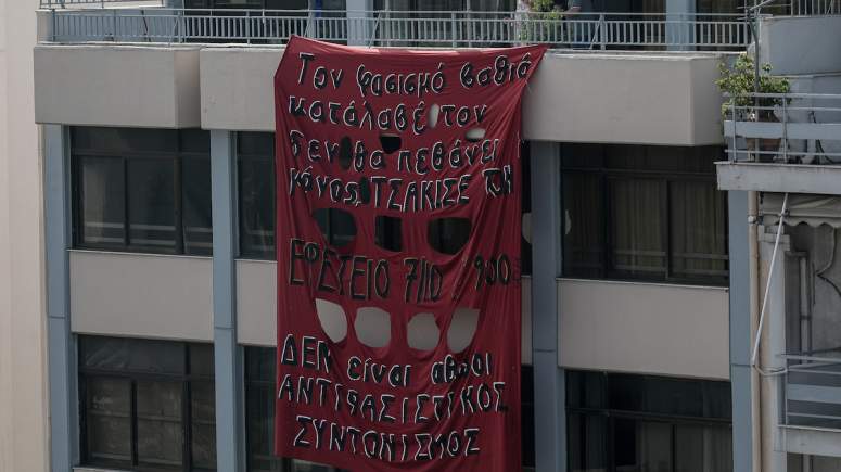 Ήδη, από τις 9 το πρωί, αναρτήθηκαν τα πρώτα πανό μπροστά από το κτήριο και συγκεκριμένα από την πλευρά της λεωφόρου Αλεξάνδρας, ενώ αυξάνεται συνεχώς ο κόσμος. Το πλήθος φτάνει από την Κηφισίας μέχρι και την Ιπποκράτους. «Ο φόβος δεν θα νικήσει», «Μόνο δικαίωση», «Ποτέ ξανά φασισμός» και «ο λαός απαιτεί, οι Ναζί στη Φυλακή», είναι ορισμένα από τα κεντρικά συνθήματα.