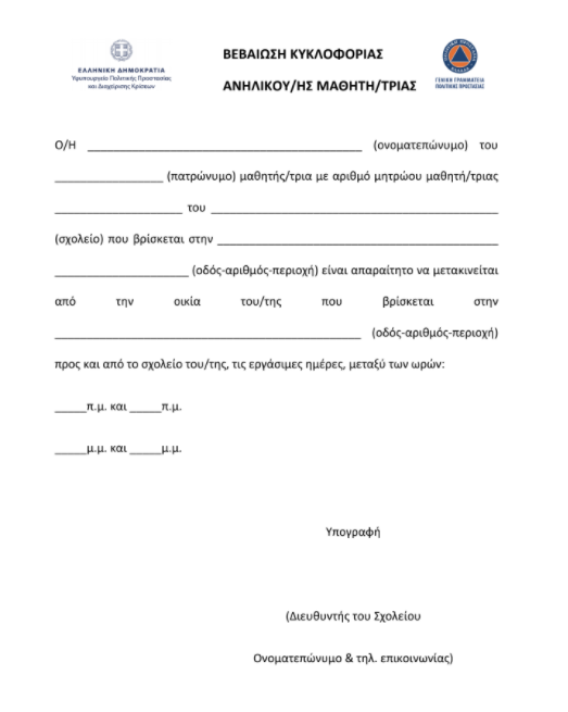 Όπως προαναφέρθηκε, απαιτείται επίσης και συμπληρωμένη βεβαίωση μετακίνησης μαθητή που θα υπογράφεται από τον διευθυντή του σχολείου, στην οποία θα αναγράφονται η διεύθυνση της σχολικής μονάδας και η διεύθυνση κατοικίας του μαθητή ή της μαθήτριας. Η μεμονωμένη μετακίνηση μαθητή είναι ακόμα εφικτή με τη συμπλήρωση της σχετικής βεβαίωσης κίνησης.