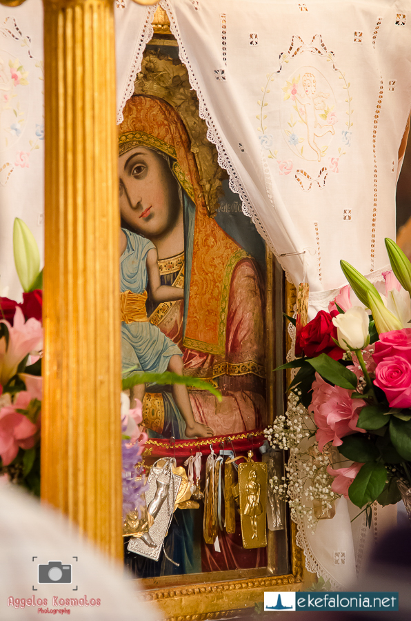 Στο πέρασμα της εικόνας απ’ τους δρόμους του Αργοστολίου, οι οποίοι ήταν πεντακάθαροι, έριχναν δαφνόφυλλά και οι κωδωνοκρουσίες και τα σαμάκια ήταν ασταμάτητα. Δεν έλλειπε το λιβάνι και το σταυροκόπημα στο πέρασμα του θρόνου της Δραπανιώτισσας, εκφράσεις πίστης και λατρείας. Παλιά η λιτανεία ξεκινούσε στις πέντε με έξη το απόγευμα και έμπαινε στο Σωτήρα γύρω στις οκτώ. Υπέροχα σχολιάζει ο Μολφέτας στο «Ζιζάνιον» το πανηγύρι της Δραπανιώτισσας, όπου μας ενημερώνει για κάποιον που είχε ξετρελαθεί για το ωραία γυναικεία κορμιά που έβλεπε στη λιτανεία.